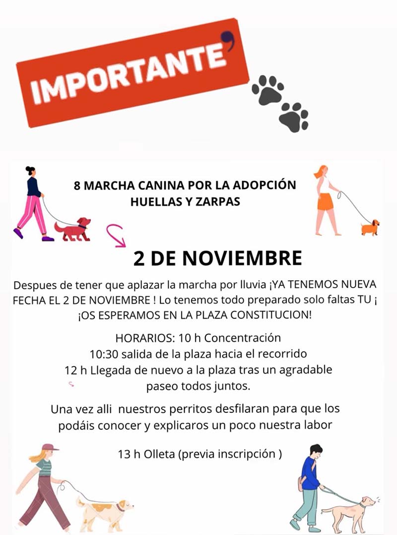 L’associació Huellas y Zarpas celebra aquest diumenge 2 de novembre la 8a Marxa Canina per l’Adopció i un Gran Mercat Solidari a favor dels drets dels animals, després d’haver hagut d’ajornar l’activitat per la pluja.