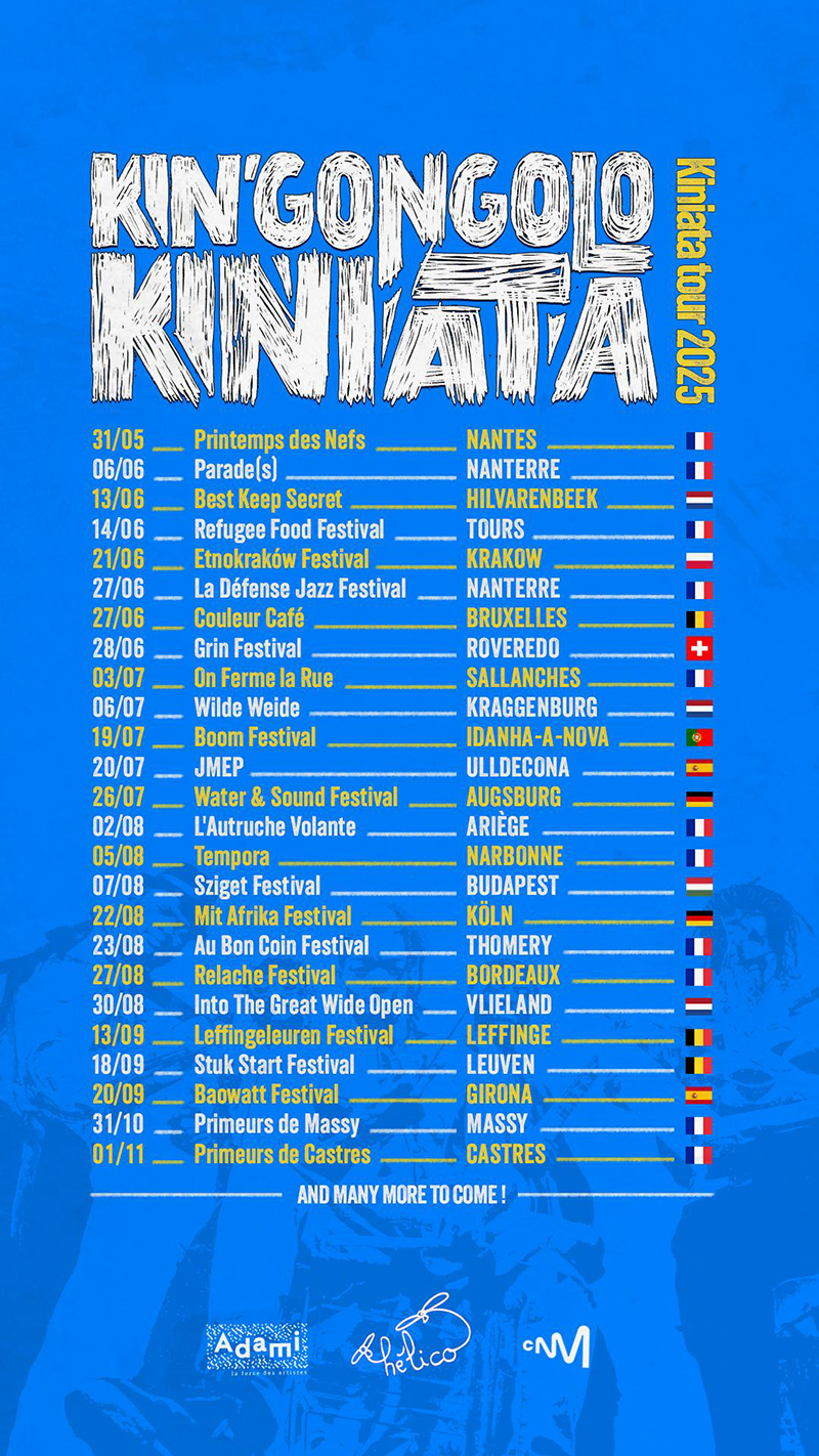 Abans de conquerir festivals internacionals Europa i Amèrica, el grup es va formar els carrers de Kinshasa, on cada soroll, cada ritme, reflecteix la realitat de la vida quotidiana. El nom “Kin’Gongolo Kiniata”, que significa “el so aclaparador”, és una metàfora perfecta per a la poderosa música del grup, creada amb instruments fets a mà amb materials reciclats com ampolles de plàstic i metall. Aquest enginy reflecteix la seva capacitat de girar el caos urbà en una simfonia única: una sorprenent barreja d’afropop, percussions hipnòtiques, punk congolès i electrònica.