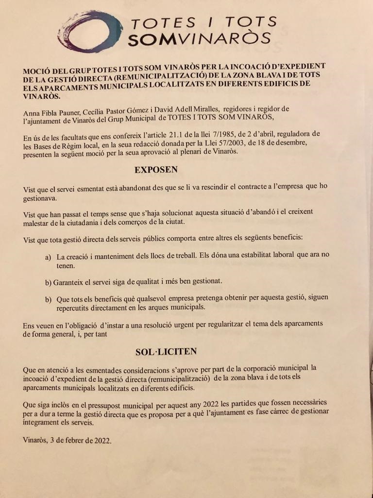 L’ajuntament aprova una moció presentada per TTSV/Podem per remunicipalitzar la zona blava i de tots els aparcaments municipals localitzats en diferents edificis de Vinaròs