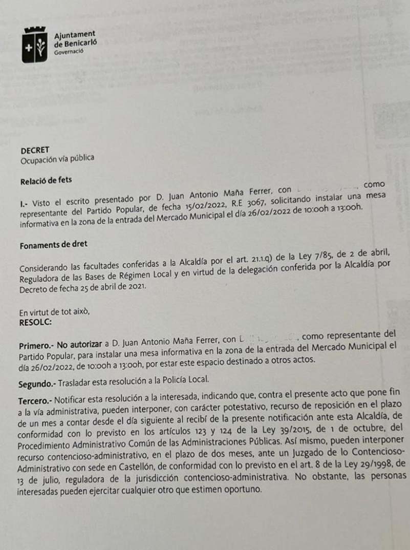 L'alcaldessa de Benicarló prohibeix al PP instal·lar una taula contra l'okupació il·legal
