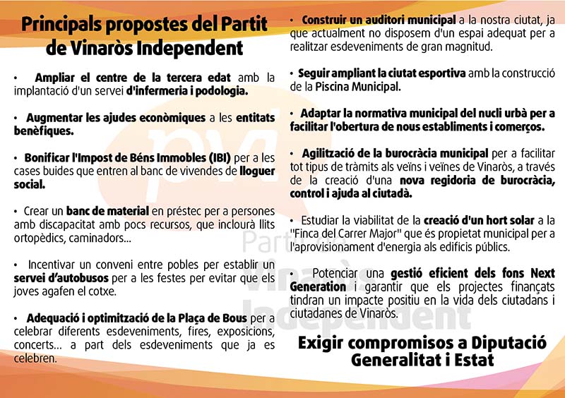 El Partit de Vinaròs Independent presenta les seves principals propostes per a millorar la ciutat: