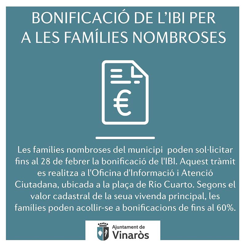 L’Ajuntament de Vinaròs obri el termini per sol·licitar la bonificació de l’IBI per famílies nombroses