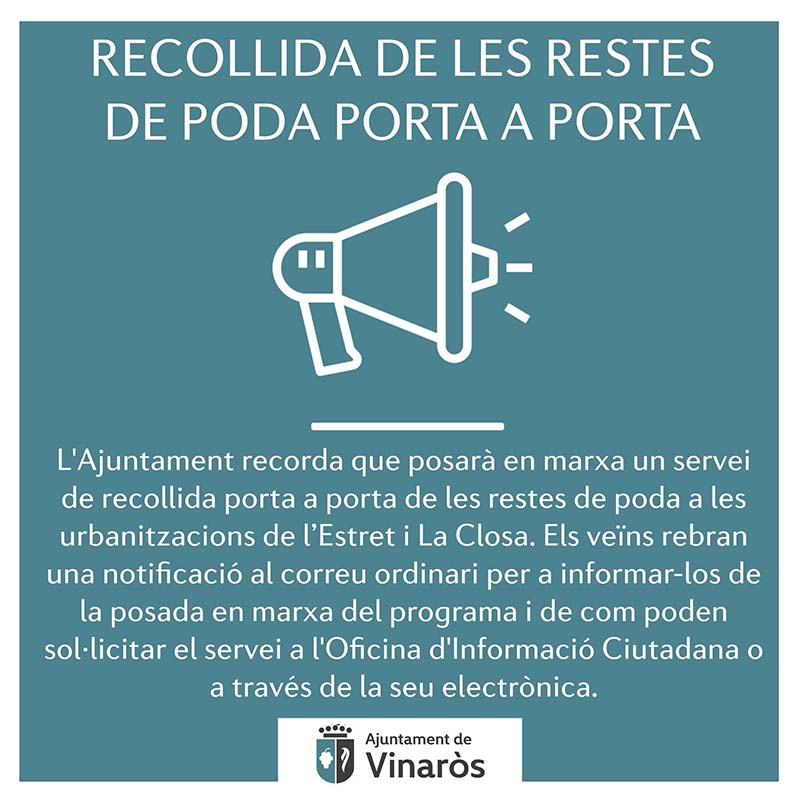L’Ajuntament recorda que posarà en marxa un servei de recollida porta a porta de les restes de poda