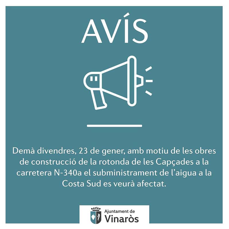 Informació de servei sobre el subministrament d’aigua a la Costa Sud de Vinaròs