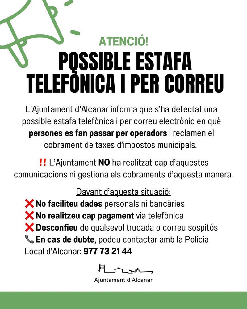 Alcanar alerta d’una possible estafa telefònica i per correu sobre impostos municipals