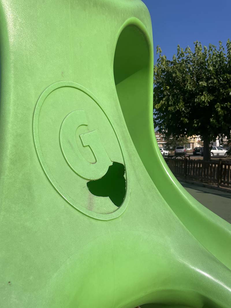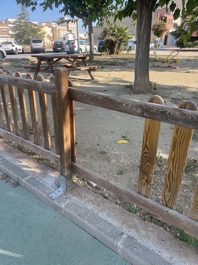 El parc infantil del Carrer Camaraes està abandonat. Falta una porta, falten fustes de la tanca perimetral. Plàstics trencats.