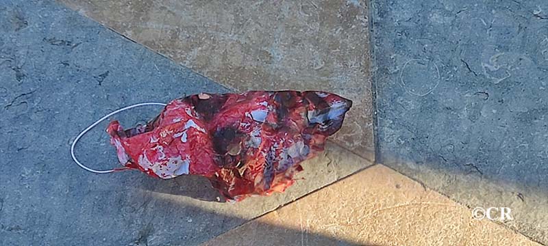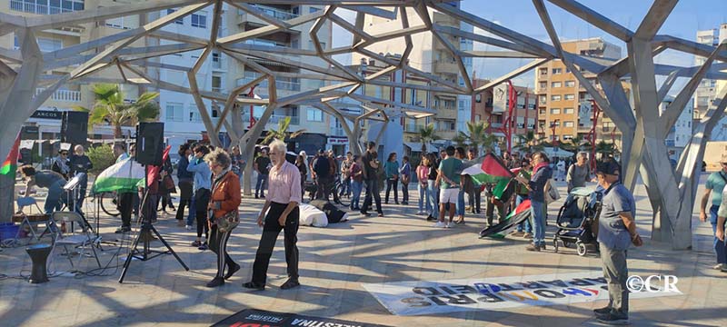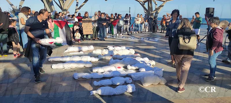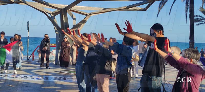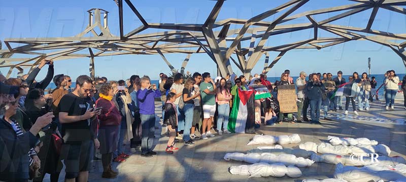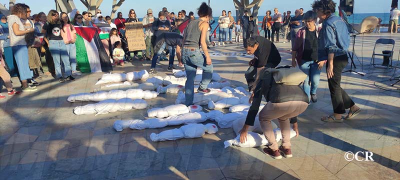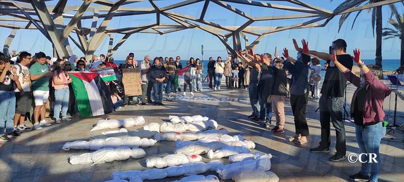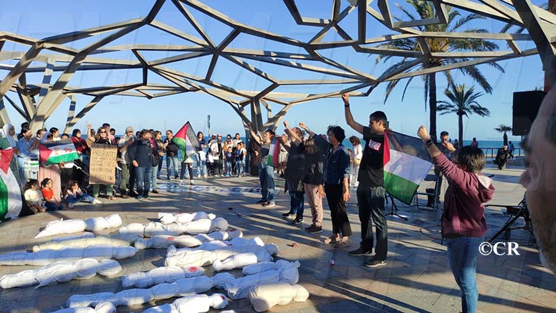 Els organitzadors han realitzat una acció reivindicativa, on diversos assistents s’han situat amb les mans plenes de pintura roja simulant sang i amb la careta del president de l’Israel Benjamin Netanyahu. Als seus peus, uns bosses plenes de coixins que simulaven els cossos dels assassinats palestins. Els altres assistents a la manifestació han acompanyat l’acció amb crits de “Netanyahu, assassí”.