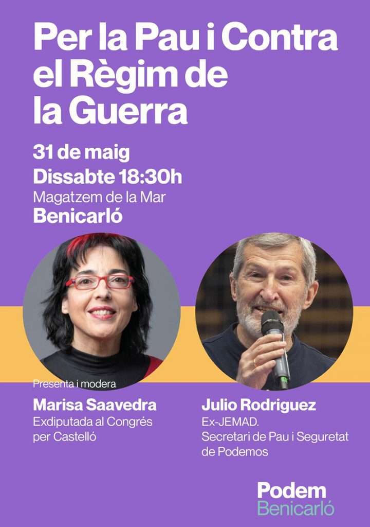 Us convidem a l’acte públic que tindrà lloc dissabte que ve 31 de Maig, en el qual comptarem amb Julio Rodríguez, Excap d’Estat Major de Defensa i Secretari de Pau i Seguretat de Podemos. Parlarem del rearmament, de l’estat de guerra en el qual està immers el món, i de diàleg i Pau.