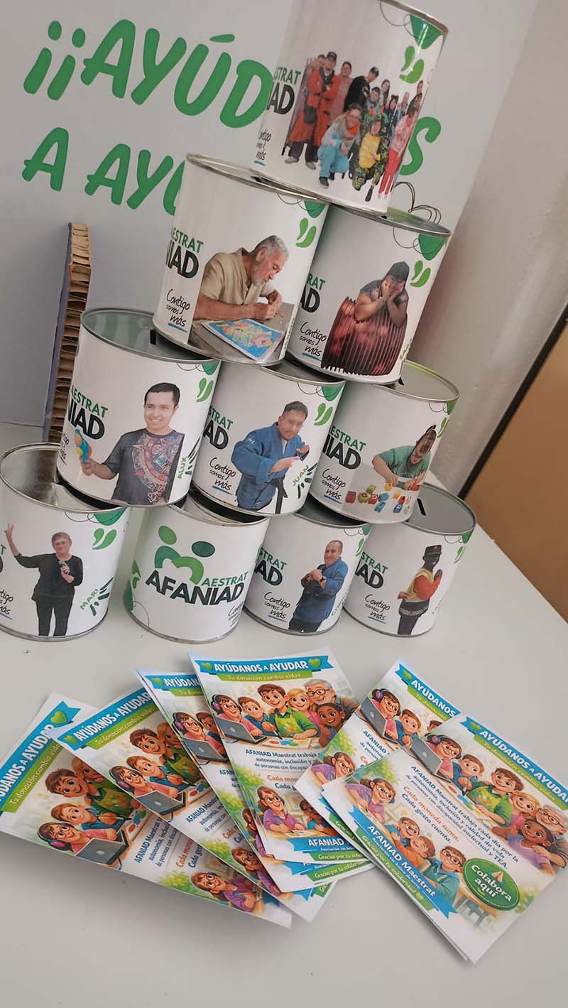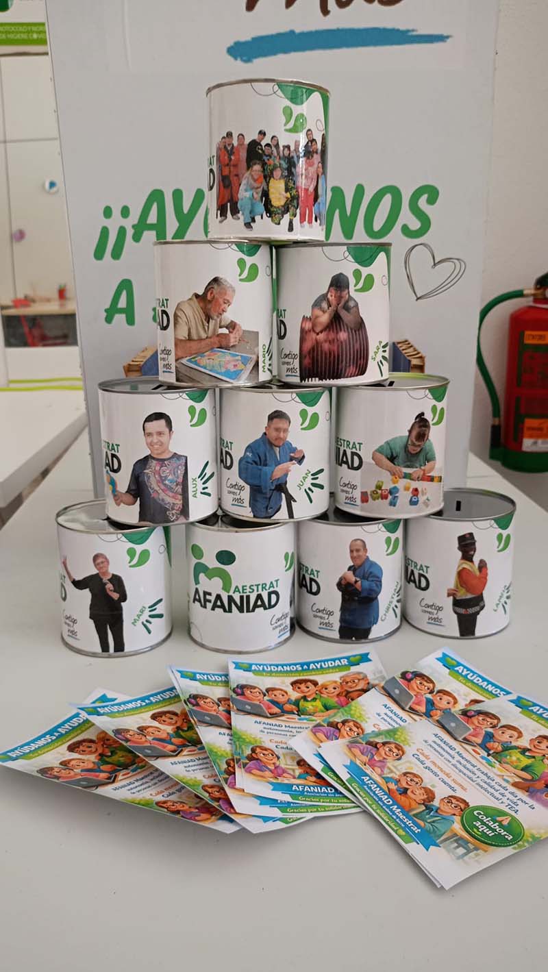 Las huchas, diseñadas con imágenes representativas de los propios usuarios y del trabajo que se desarrolla en el centro, buscan visibilizar la realidad de las personas atendidas por AFANIAD Maestrat y fomentar la implicación social. Cada aportación, por pequeña que sea, contribuirá directamente a la mejora de la calidad de vida de los usuarios.