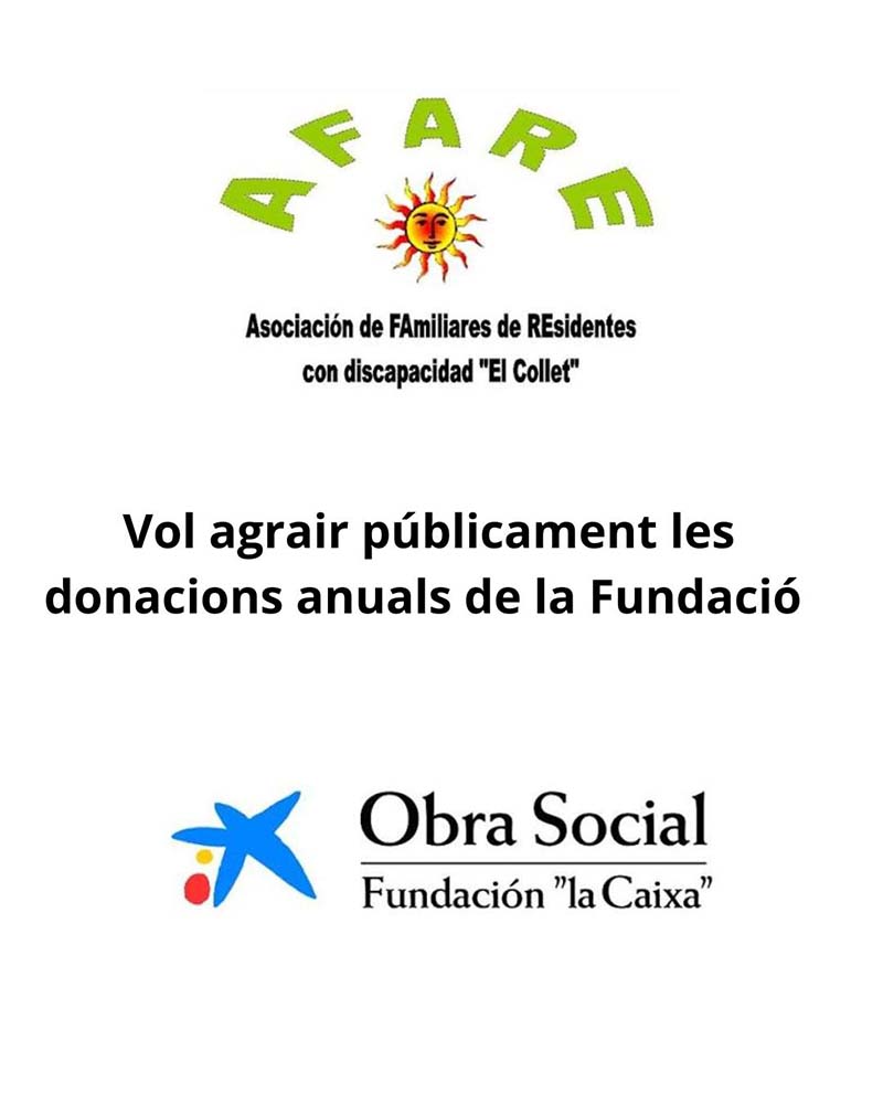 L’associació AFARE, Associació de Familiars de Residents amb Discapacitat “El Collet”, vol agrair públicament les donacions anuals de la Fundació “la Caixa” de CaixaBank Benicarló, que fan possible el desenvolupament del programa de musicoteràpia adreçat als residents del centre.
