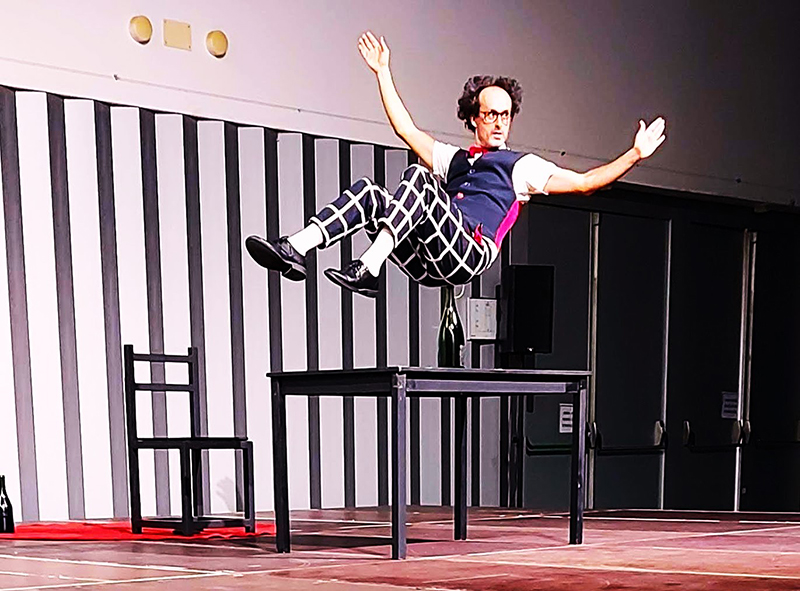 Situació còmica amb desequilibris i equilibris sobre ampolles de vidre i objectes, ball, habilitats i bestieses… !!!!!