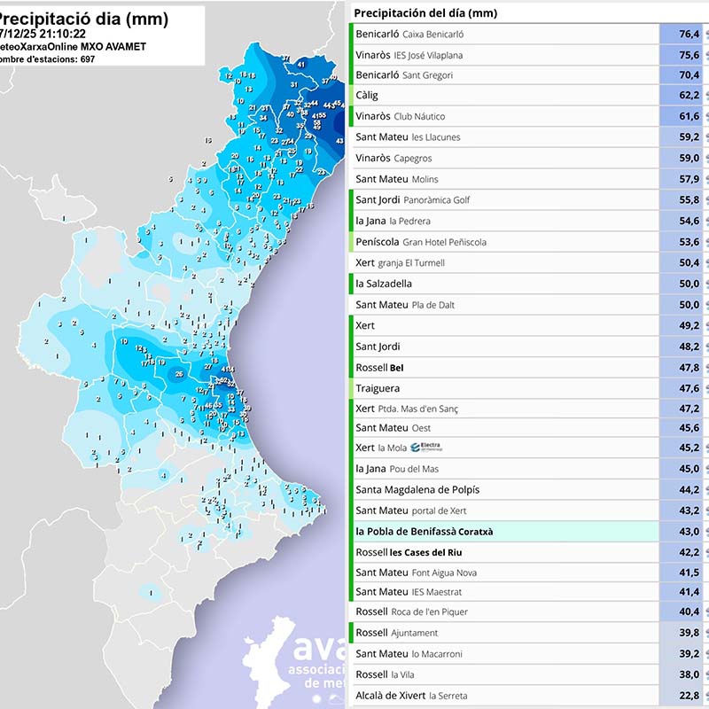Benicarló i Vinaròs encapçalen els registres de precipitació amb més de 75 l/m² en una jornada de pluja intensa
