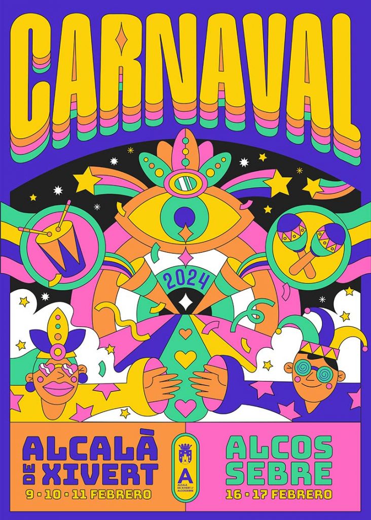 Alcalà-Alcossebre es prepara ja per a la celebració d’una nova edició del Carnaval. El regidor de Promoció Cultural i Festiva, Javi García Pitarch, ha anunciat en roda de premsa les principals novetats i qüestions a tindre en compte de cara a aquesta festa, que es viu de manera intensa en tots dos nuclis. En Alcalà, el Carnaval se celebrarà del 9 a l’11 de febrer i, a Alcossebre, del 16 al 18 de febrer. Respecte al cartell anunciador de la festa, s’ha optat per un disseny que pretén comunicar “l’explosió d’alegria, color i sentiment que és el nostre Carnestoltes”, explicava l’edil de Promoció Cultural i Festiva, Javi Garcia Pitarch. Els creadors són Pistacho Studio de Benicarló i, com a inspiració, s’ha pres l’estètica psicodèlica dels anys 60 del segle XX.