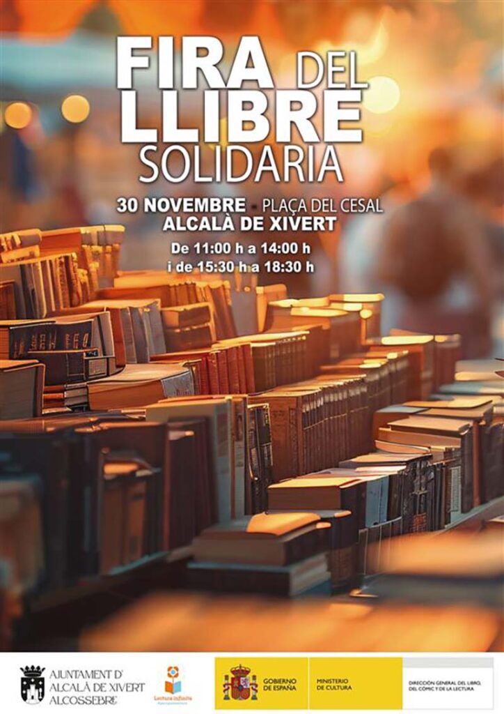 Aquest diumenge 30 de novembre, Alcalà de Xivert acollirà una Fira del Llibre Solidària, una jornada cultural i participativa organitzada per l’associació Ciudad de Cuentos, amb la col·laboració de l’Ajuntament d’Alcalà-Alcossebre. La iniciativa forma part de les Subvencions per a la Promoció de la Lectura i les Lletres Espanyoles 2025, dirigides als municipis afectats per la DANA.