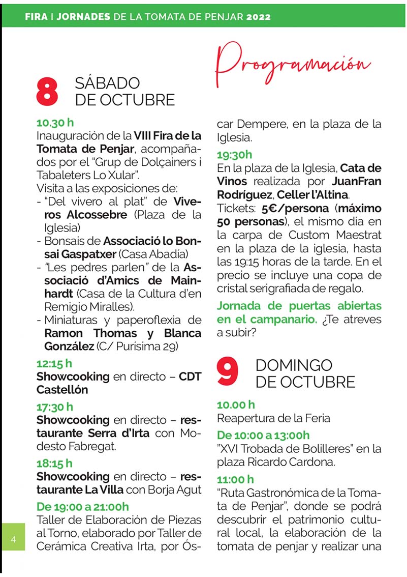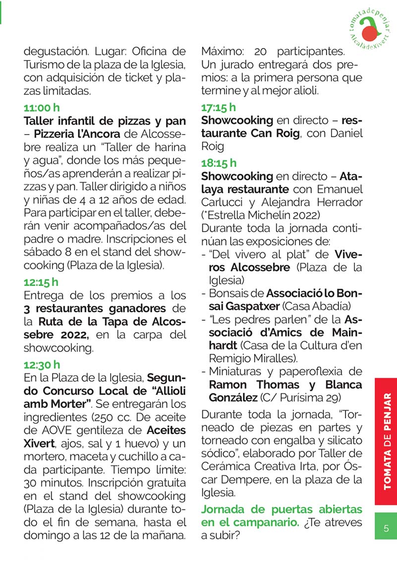 Un altre atractiu és que, durant tota la fira, es podrà pujar al campanar d’Alcalà per a observar les seves impressionants vistes i es realitzarà una visita guiada, el dissabte a partir de les 11.00h, en la qual es podrà descobrir el patrimoni de la localitat i conèixer millor com es conrea i es produeix la tomata de penjar, a través d’una exposició.