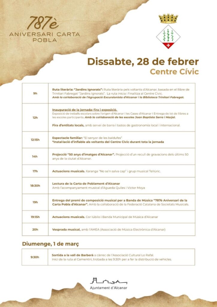 Amb l’objectiu de consolidar la jornada al llarg del temps, el pròxim dissabte, dia 28 de febrer, Alcanar celebrarà el 787è aniversari de la seua Carta Pobla amb un programa d’activitats molt ampli i per a tots els públics. El Centre Cívic, amb una fira d’entitats locals, serà l’epicentre d’una celebració que és fruit del treball conjunt de l’Ajuntament i el teixit associatiu del municipi.