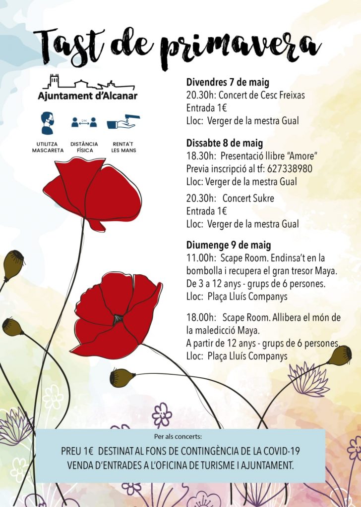 No obstant això, l’índex de vacunació al municipi ha augmentat en els darrers dies i en aquests moments la situació epidemiològica es troba estable. Per aquest motiu, l’Ajuntament d’Alcanar ha preparat una programació cultural per a aquest cap de setmana seguint les mesures de seguretat i protecció que marca el Procicat, amb el propòsit de celebrar un altre Tast de primavera la setmana vinent, una vegada ja s’haja aixecat l’estat d’alarma.