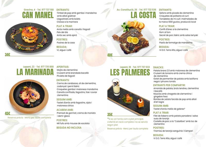 Durant les jornades, els restaurants oferiran propostes culinàries diferents, adaptades a l’actualitat, amb la clemetina com a ingredient principal, posant en valor la riquesa gastronòmica i el producte local del municipi.