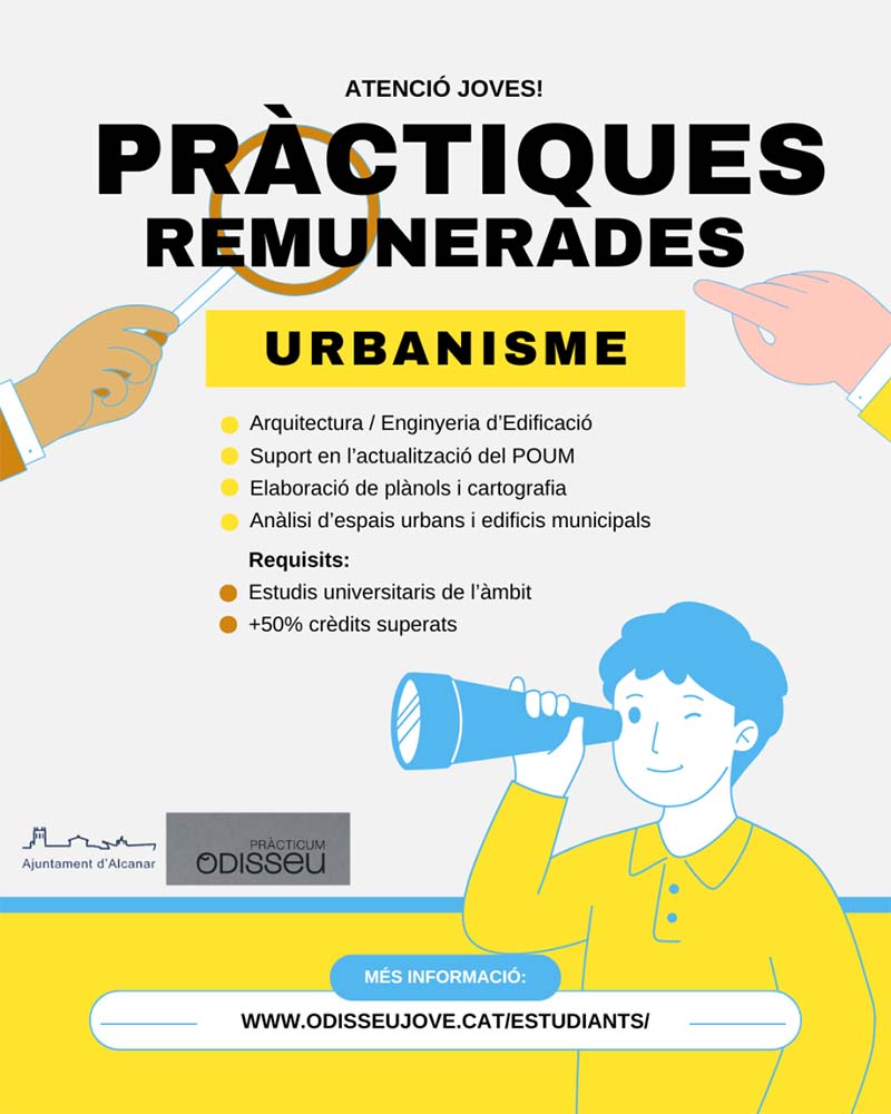 L’Ajuntament d’Alcanar aposta pel talent jove amb la convocatòria de dues places de pràctiques universitàries remunerades a través del programa Pràcticum Odisseu. La iniciativa vol facilitar la inserció laboral dels estudiants i, alhora, apropar-los a la realitat professional del territori.