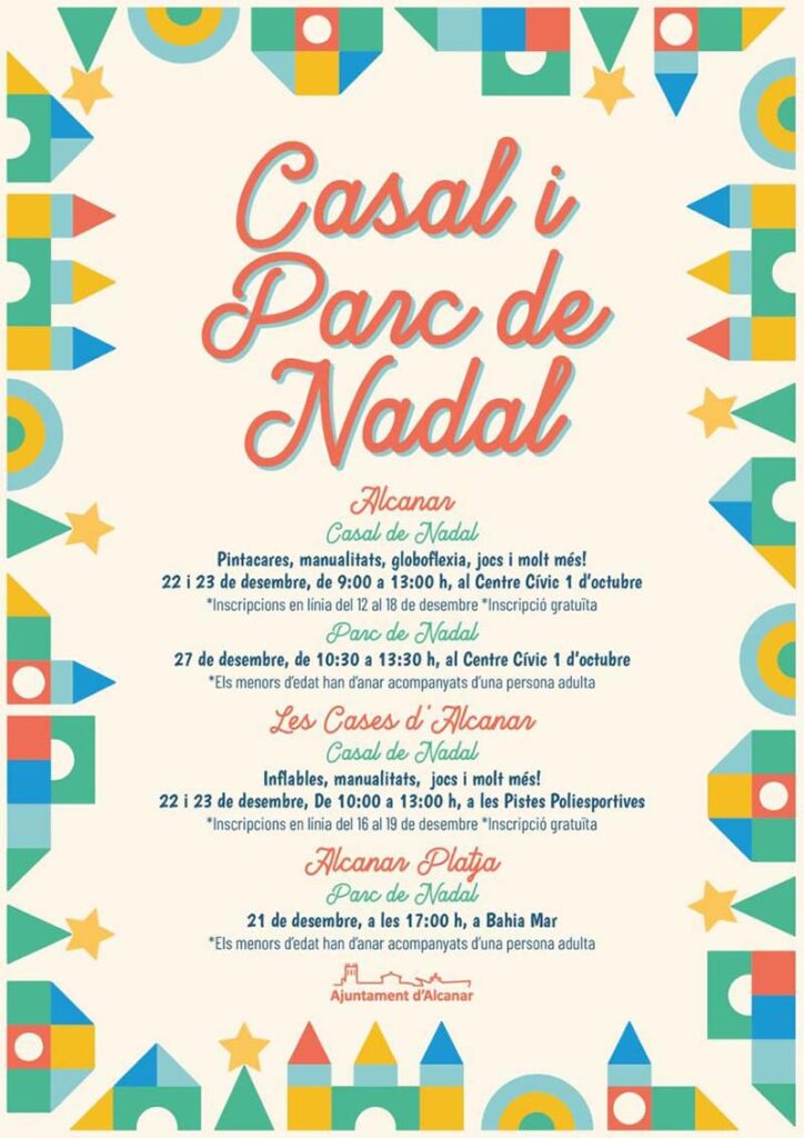 El Casal de Nadal, on les famílies podran deixar els seus xiquets i xiquetes prèvia inscripció, s’oferirà els dies 22 i 23 de desembre tant a Alcanar (de 9:00 a 13:00 h, al Centre Cívic 1 d’octubre) com a les Cases (de 10:00 a 13:00 h, a les Pistes Poliesportives), amb pintacares, manualitats, globofexia i multitud de jocs. Les inscripcions, gratuïtes i en línia (el mateix dia d’obertura es publicarà el link), es podran fer del 12 al 18 de desembre a Alcanar i del 16 al 19 de desembre a les Cases.