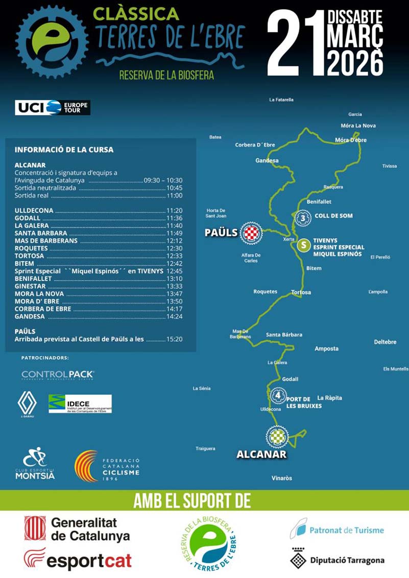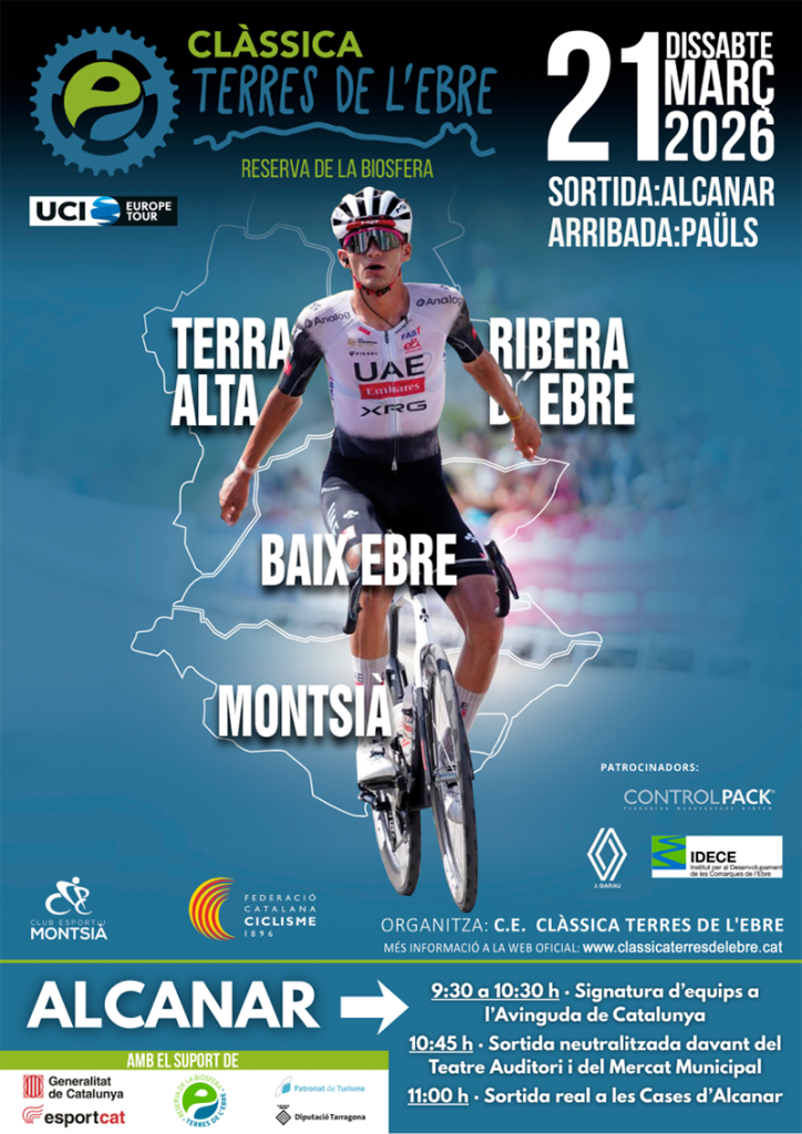 El compte enrere arriba al final. Queda poc més d’una setmana perquè Alcanar done el tret d’inici a la III Clàssica Terres de l’Ebre. El dissabte 21 de març, el municipi acollirà la sortida de la prestigiosa prova ciclista, que es podrà seguir per televisió a través d’Eurosport, Esport3, TV3, Claro Sports, TDP y Staylive, arribant a 180 llars d’arreu del món. L’any passat, va acumular 220 milions d’impactes en mitjans de comunicació. Un aparador únic per a projectar la localitat, que serà una festa des de primera hora del matí.
