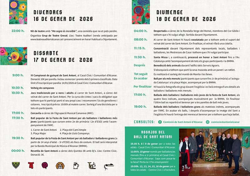 També s’han presentat els horaris per als assaigos del tradicional ball de Sant Antoni, que van començar el passat 8 de gener i continuaran avui a les 19:00 h per a totes les edats al Casal Cívic i Comunitari d’Alcanar. El dissabte 10 es realitzaran a les 11:00 h sols per a balladors/es menuts (fins a 1r de primària), mentre que des del dia 12 fins al 16 de gener, tornaran a ser per a totes les edats i a les 19:00 h, però en aquest cas al Centre Cívic 1 d’octubre.