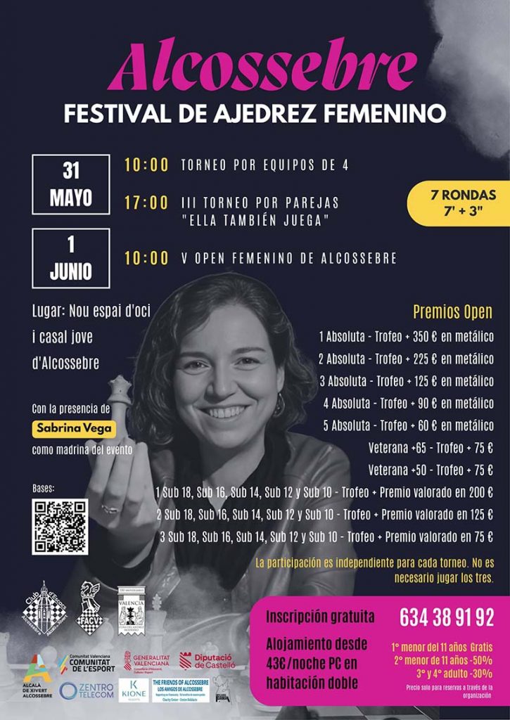 L’Espai d’Oci d’Alcossebre es convertirà el cap de setmana del 31 de maig i 1 de juny en l’epicentre dels escacs femenins, a nivell nacional, amb la celebració de diverses competicions. El dissabte 31 de maig, la jornada s’iniciarà a partir de les 10.00h, amb un torneig per equips de 4 i, a les 17.00h, amb el III Torneig per parelles “Ella també juga”. El diumenge 1 de juny, a les 10.00h, tindrà lloc el V Open Femení d’Alcossebre. Un dels al·licients més destacats serà la presència, com a padrina de l’esdeveniment, de la jugadora Sabrina Vega, màxima figura dels escacs femenins a Espanya, que compta, en el seu palmarés, amb el títol de Mestra Internacional d’Escacs. També ha sigut nou vegades campiona d’Espanya i ha participat representant en les Olimpíades d’Escacs.