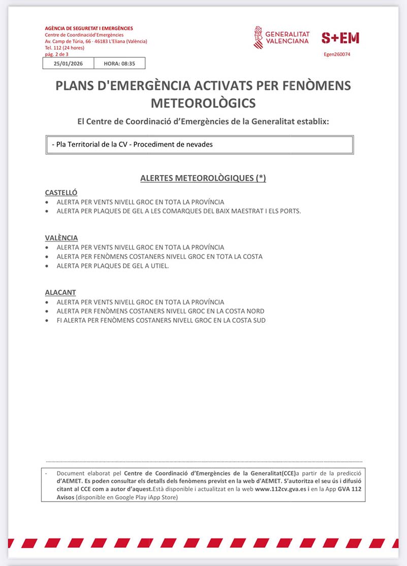El Centre de Coordinació d’Emergències de la Generalitat ha activat el Pla Territorial d’Emergències de la Comunitat Valenciana, dins del procediment per nevades, davant la previsió de fenòmens meteorològics adversos.