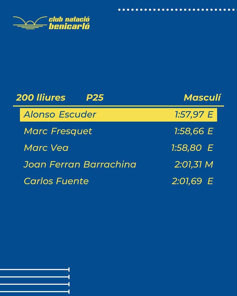 El Club Natació Benicarló vol felicitar Alonso Escuder per aquest assoliment, que reflecteix l’esforç, la constància i el talent dels seus nedadors, i destaca la qualitat del treball tècnic del club.