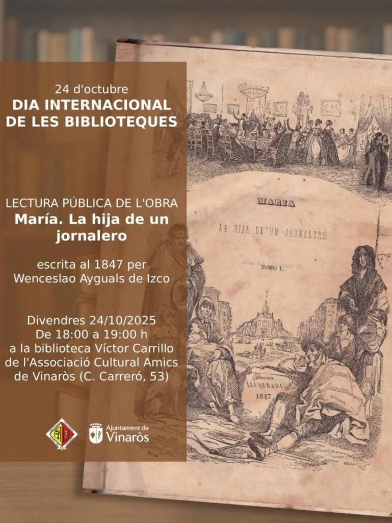 L’Associació Cultural “Amics de Vinaròs” ha anunciat, a través de les seves xarxes socials, la celebració del Dia de les Biblioteques aquest 24 d’octubre amb la lectura pública d’un capítol de l’obra “Maria: La hija de un jornalero”, una de les obres de l’escriptor periodista, editor i polític de la literatura espanyola del segle XIX, Wenceslao Ayguals d’Izco.