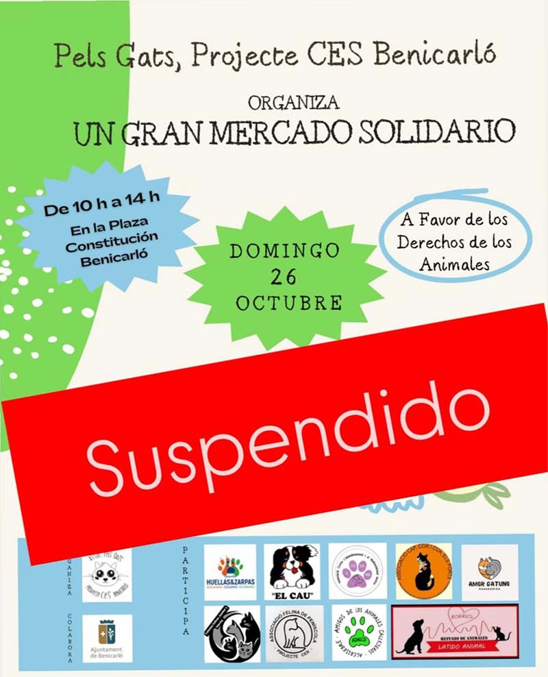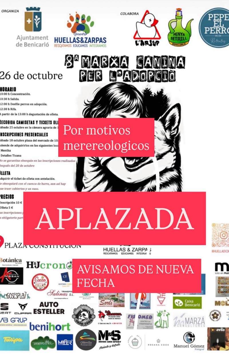 L’organització de la VIII Marxa per l’Adopció i el Gran Mercat Solidari de Huellas y Zarpas ha informat que, per motius climatològics, els esdeveniments previstos per a hui diumenge 26 d’octubre queden aplaçats.