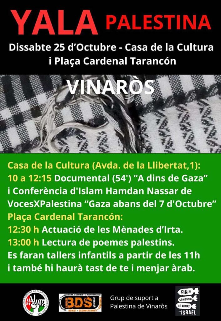 El Grup de Suport a Palestina de Vinaròs ha organitzat per al proper dissabte, una segona edició de la jornada “Yala, Palestina” ( Endavant, Palestina!). L’objectiu és continuar denunciant el genocidi i l’actuació criminal de l’Estat d’Israel cap al poble Palestí . No creiem en l’anomenat “Acord o pla de pau” – més bé un acte esperpèntic- signat el passat 12 d’octubre en Egipte entre EE.UU i els països anomenats “mediadors” ,però on no estava cap representant dels actors principals ( Palestina i Israel ) .Més de quaranta morts durant l’últim cap de setmana evidencien quines són de veres els objectius d’Israel .