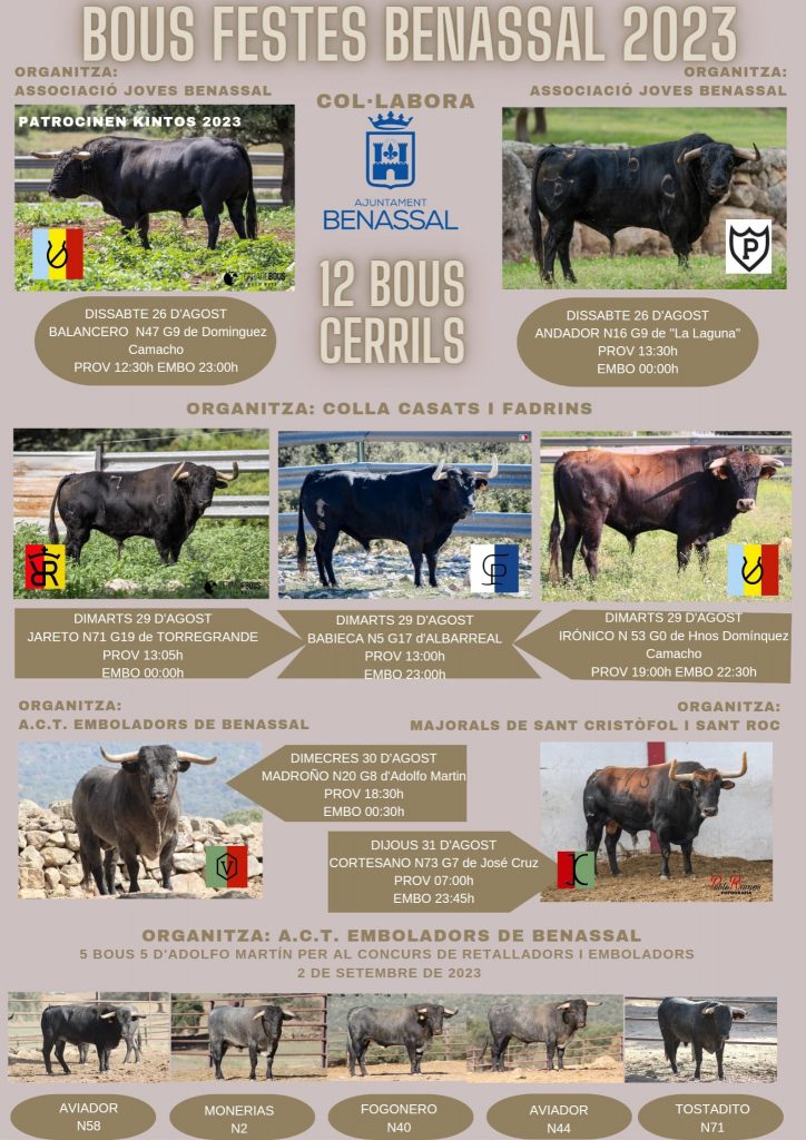 L’Ajuntament de Benassal, l’Associació Joves Benassal, Kintos 2023, l’A.C.T. Emboladores de Benassal, Colla Casats i Fadrins i Majorals de Sant Cristòfol i Sant Roc han presentat el cartell taurí per a les festes d’agost 2023.
