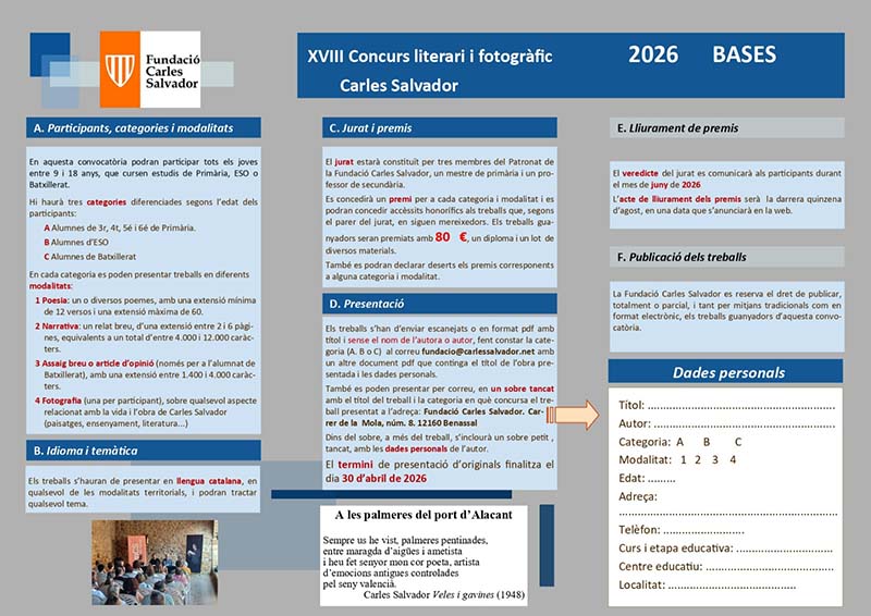 La Fundació Carles Salvador de Benassal ha convocat la XVIII edició del Concurs Literari i Fotogràfic Carles Salvador, una iniciativa consolidada que té com a objectiu promoure la creativitat entre els més joves i fomentar l’ús del valencià com a llengua de cultura, cohesió i expressió.