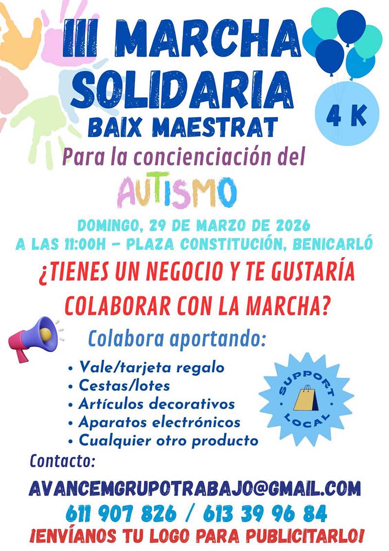 L’entitat Avancem Baix Maestrat ha organitzat la III Marxa Solidària Baix Maestrat per la conscienciació de l’autisme, que se celebrarà el pròxim diumenge 29 de març de 2026 a Benicarló.
