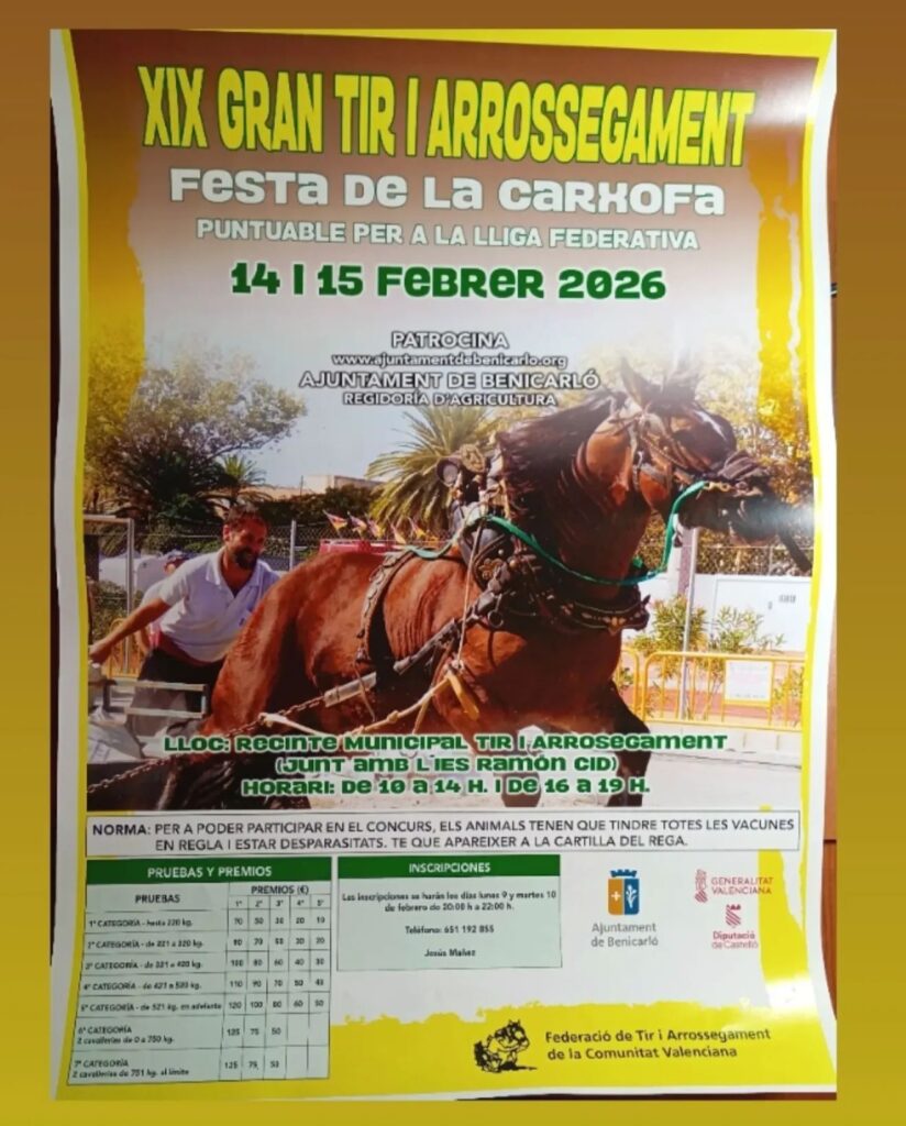 Benicarló acollirà el XIX Tir i Arrossegament amb motiu de la Festa de la Carxofa 2026, un esdeveniment ja consolidat i molt esperat pels aficionats al món del cavall.