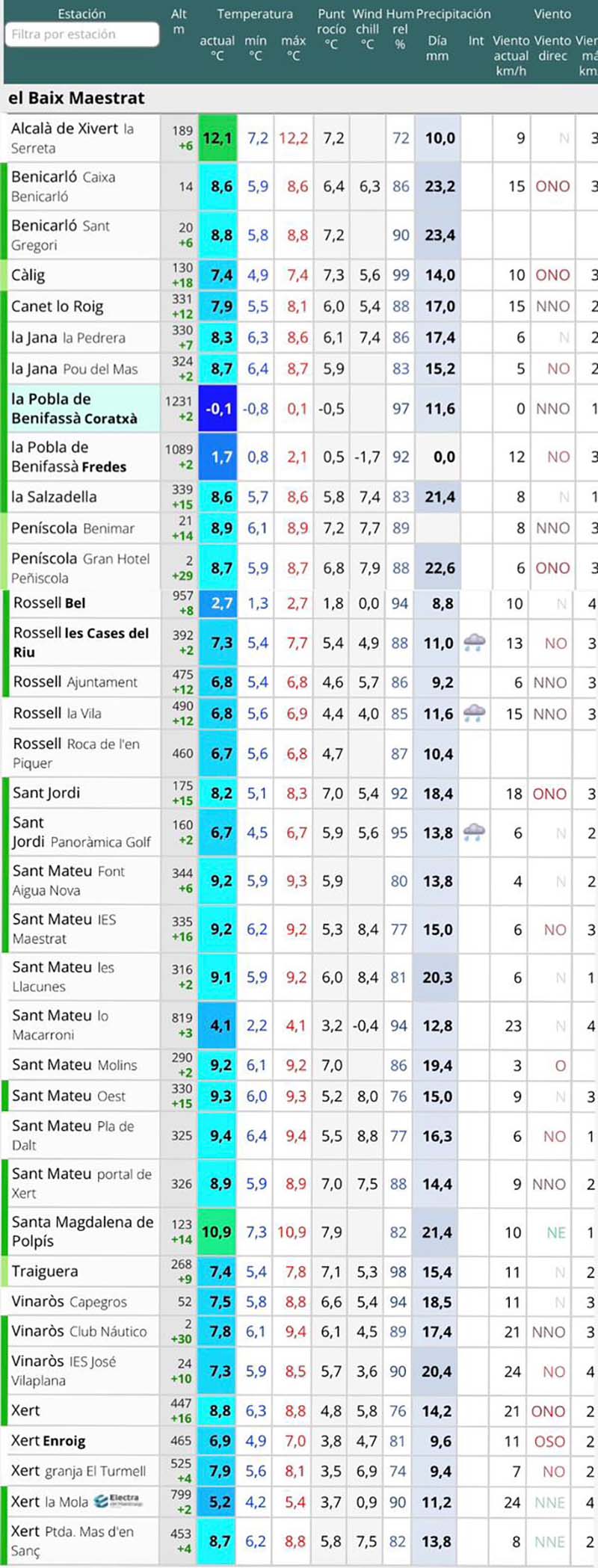 Benicarló ha sigut el municipi del Baix Maestrat que ha registrat la major quantitat de precipitacions durant la matinada del segon dia de Nadal. Segons les dades recollides, s’han acumulat 23,4 litres per metre quadrat a la zona de Sant Gregori i 23,2 litres per metre quadrat al centre de la població.