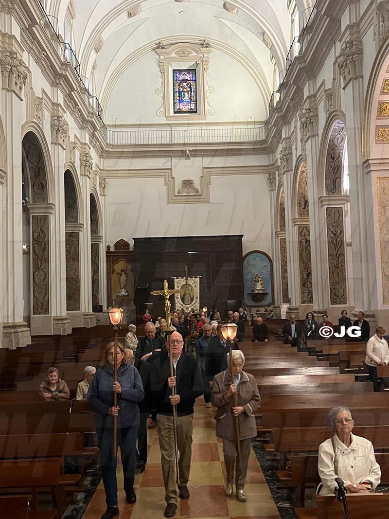 En octubre nos ha visitado la lluvia en dos ocasiones: el segundo y cuarto domingo. Por eso hoy no hemos salido a procesionar por las calles, y el rosario se ha desarrollado en el interior del templo. Se ha rezado cantando-piropeando a la Señora del Rosario desde nuestra poquedad y humildad, ya que nos vemos como muy necesitados de su amparo y protección. Ella que se ha definido como la esclava del Señor nos ha marcado el camino de la humildad, virtud que es la morada de la caridad y que nos aleja de la autocomplacencia tan propia de los soberbios. En cuanto aumenta nuestro amor a ella, más nos entregamos a la ayuda de nuestros vecinos.