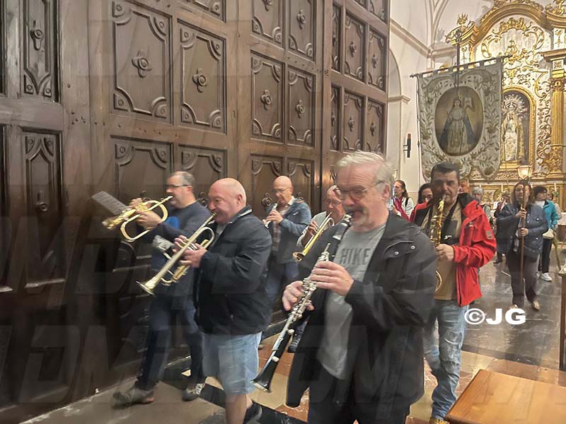 Ella nos guía a convivir con Jesús y a estar pendientes de los demás. Hoy nos hemos visto acompañados por los implosivos compases que esta mañana han resonado en el templo por el grupo perseverante de los músicos, y por las voces de todos que brotaban de nuestros corazones: el Ave María, llena de gracia, el Señor es contigo…; la respuesta del santa María madre de Dios ruega por nosotros pecadores; los penetrantes sonidos que entonan el Gloria al Padre, al Hijo y al Espíritu Santo y esa oración tan íntima y cariñosa de llamar Padre a Dios del Padre nuestro para que venga su Reino y finalmente, reunidos ante la Virgen del Roser, con el canto de los gozos que después de piropear a la Señora (tus hermosos ojos, llenos de piedades a nosotros vuelve soberana madre) terminan con la súplica de que en las aflicciones siempre nos ampares. Somos como niños, pero qué bien se reposa en su regazo de madre.