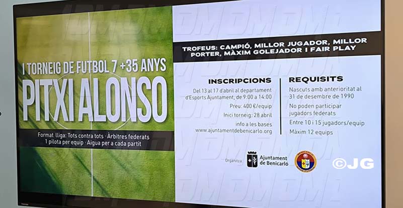 L’Ajuntament de Benicarló i el Benicarló Base Futbol han presentat aquest matí el I Torneig de Futbol 7 +35 “Pitxi Alonso”, una nova iniciativa esportiva dirigida a jugadors veterans que es disputarà del 13 al 17 d’abril, amb inici oficial de la competició el 28 d’abril, segons les bases.