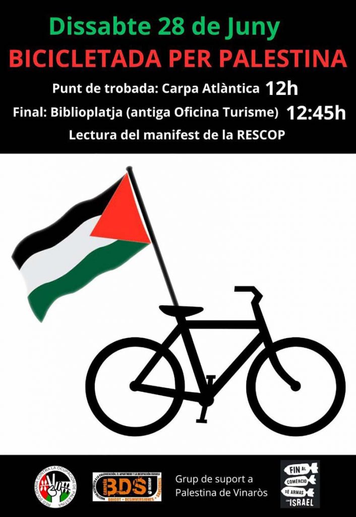 Afegeix-te a la Bicicletada, vine amb la teua bici i pedaleja per Palestina! La cita , el dissabte 28 de juny, a les 12.00 del migdia en la Carpa Atlàntica. de Vinaròs ( platja Fora Forat ) .També pots unir-te a les 12:45 a la lectura del Manifest en l’antiga oficina de Turisme del passeig.