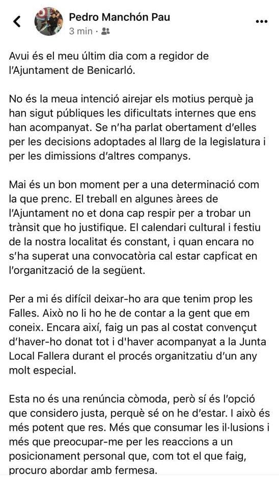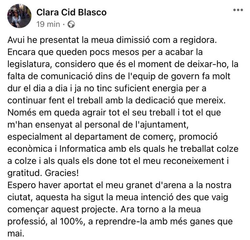 Amb aquests, ja són 4 els regidors de l’equip de govern del partit PSOE, (Román Sánchez, Filo Agut, Pedro Manchón i Clara Cid), que han dimitit aquesta legislatura, a 3 mesos d’acabar la legislatura