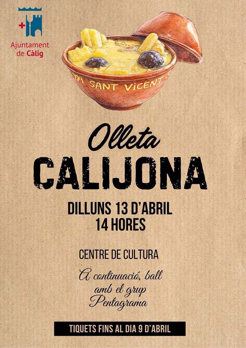 - Dilluns 13 d’abril, 14:00 h: Olleta Calijona, organitzada per l’Ajuntament amb la col·laboració de les mestreses de casa. Després del dinar, el grup Pentagrama animarà el ball, oferint música en directe per a tots els assistents.