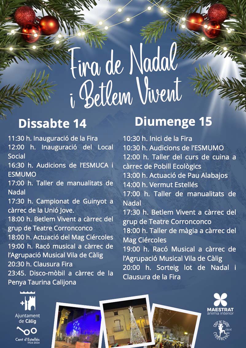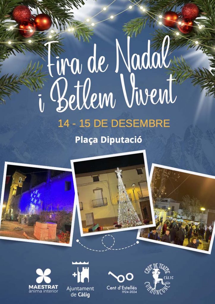 L’Ajuntament de Càlig, gràcies a la participació de les empreses locals, entre altres col·laboradors, celebrarà un any més la tradicional Fira de Nadal a la plaça Diputació. L’espai s’omplirà de paradetes amb productes de proximitat i nadalencs, a més d’oferir activitats per a tots els públics amb tallers de màgia, actuacions musicals i un vermut poètic dedicat a Vicent Andrés Estellés, a més d’un concert per part de Pau Alabajos i fins i tot disco-mòbil per als joves, entre altres propostes.