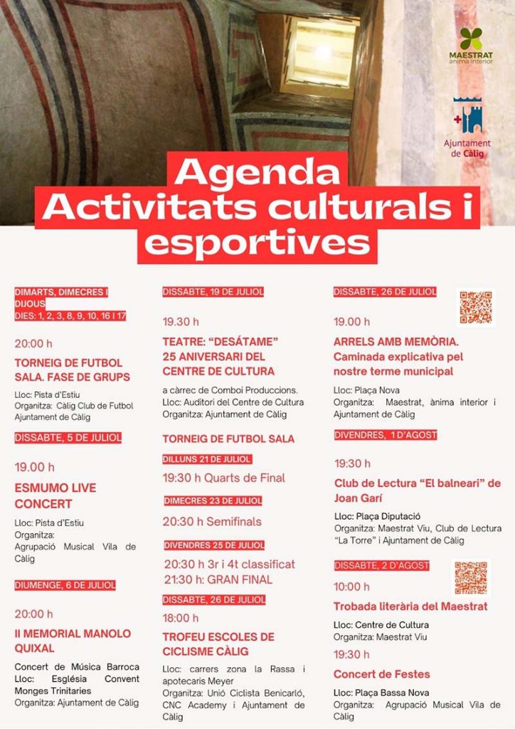 El teatre també formarà part de l’agenda cultural amb l’obra Desátame de la companyia Comboi Produccions, una actuació molt especial perquè servirà per a celebrar el 25 aniversari del Centre de Cultura. Dintre del mes de juliol s’oferirà l’activitat Arrels amb memòria, una caminada explicativa pel terme municipal de Càlig per a donar a conèixer la història, al mateix temps que es fa una mica de senderisme.