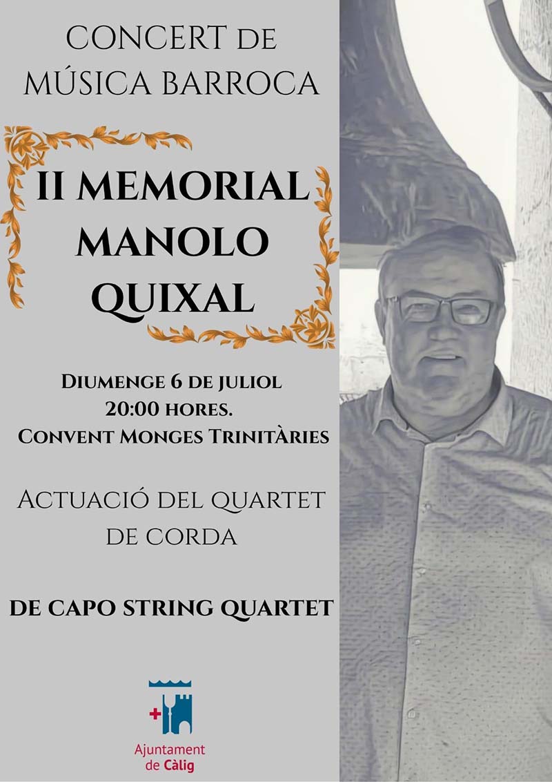 La programació de l’estiu també comptarà amb concerts per part de l’Agrupació Musical Vila de Càlig amb ESMUMO Live Concert i l’esperat recital de festes com a preàmbul de les Festes Patronals en honor Sant Llorenç. També dintre de l’àmbit musical s’oferirà el II Memorial Manolo Quixal al Convent de les Monges Trinitàries amb un concert de música barroca, a càrrec del quartet de corda Capo String Quartet, per recordar aquesta important figura del municipi.