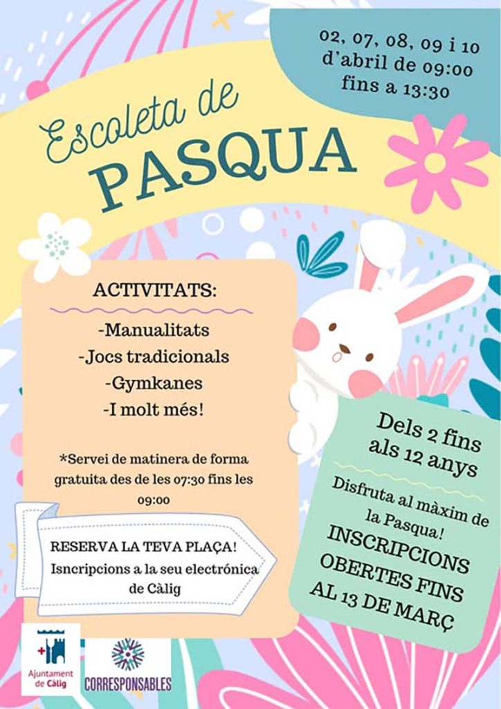 L’Ajuntament de Càlig posarà en marxa una nova edició de l’Escoleta de Pasqua adreçada a xiquets i xiquetes d’entre 2 i 12 anys.