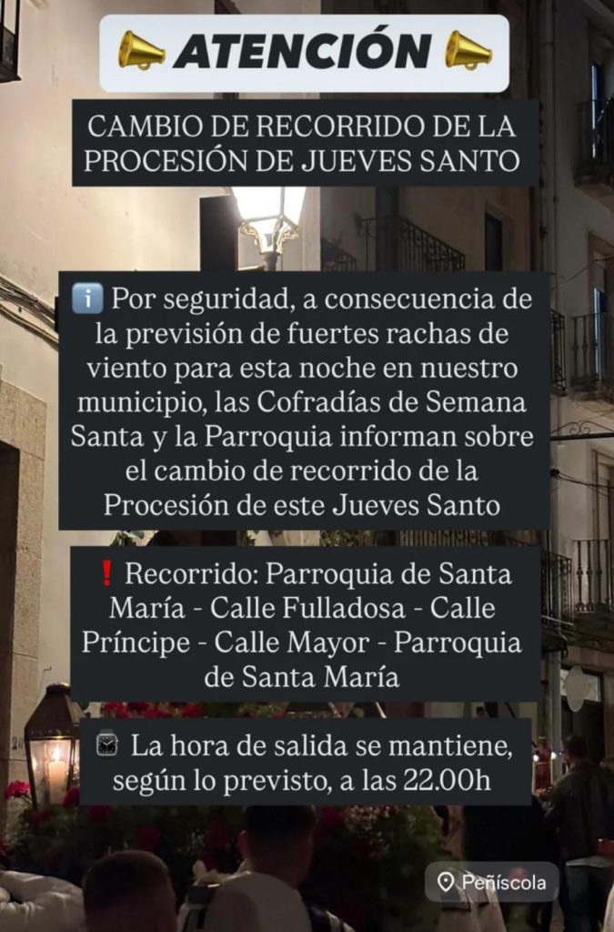 Les confraries de Setmana Santa i la Parròquia de Santa María de Peñíscola han informat d’un canvi en el recorregut de la processó de Dijous Sant a Peníscola per motius de seguretat davant la previsió de fortes ratxes de vent.