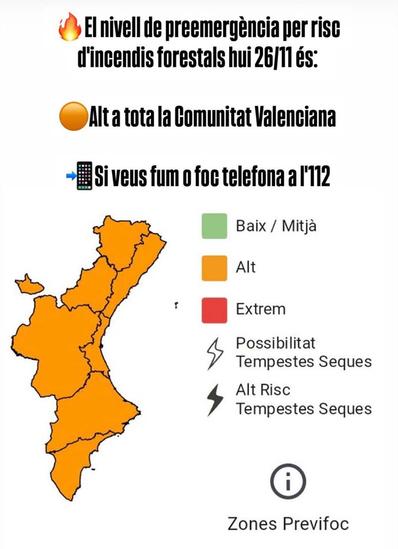 Preemergència per risc d’incendis forestals: nivell ALT a tota la Comunitat Valenciana (26/11)