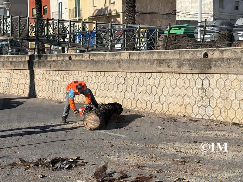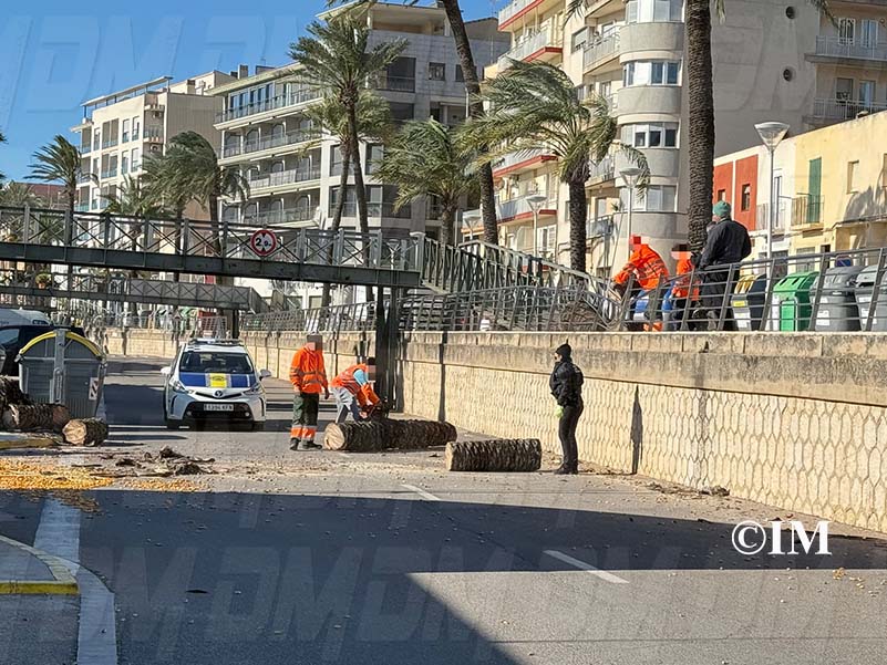 Posteriorment, la brigada de jardineria municipal ha procedit a tallar i retirar la palmera caiguda. A més, s’ha precintat una segona palmera propera que podria caure si no amainen les ratxes de vent en les pròximes hores.